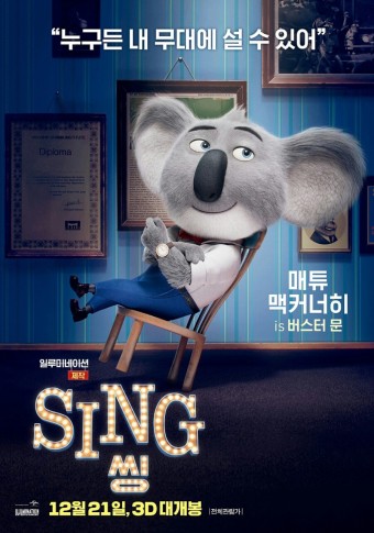[Sing]은 쇼비즈(showbiz)와 음색 발견(tone-discovery)의 세계로 컬트(cult) 여행을 떠나는 애니메이션 뮤지컬 코미디 영화입니다. 의인화된 생명체가 거주하는 북적거리는 거대 도시를 배경으로 한 이 영화는 야심찬 코알라 버스터 문(Buster Moon)을 따라 노래 대회를 개최함으로써 망해가는 극장을 구하기 위해 노력합니다. 매력적인 캐릭터의 다른 캐스팅, 발가락을 두드리는 음악, 그리고 기쁜 줄거리로 싱은 모든 시대의 관찰자들을 즐겁게 하는 동시에 꿈을 쫓고 개성을 받아들이는 것에 대한 소중한 과제를 전달하고자 하는 영화 입니다.